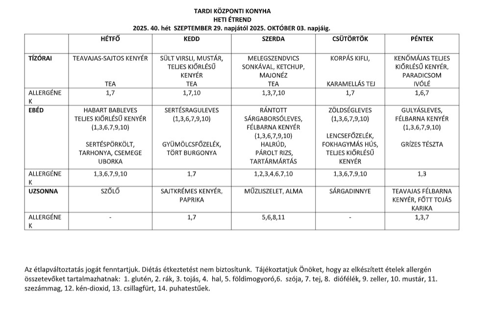 TARDI KÖZPONTI KONYHA HETI ÉTREND 2025. 40. hét SZEPTEMBER 29. napjától 2025. OKTÓBER 03. napjáig.