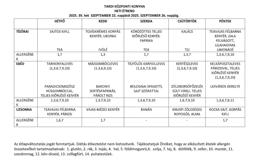 TARDI KÖZPONTI KONYHA HETI ÉTREND 2025. 39. hét SZEPTEMBER 22. napjától 2025. SZEPTEMBER 26. napjáig.
