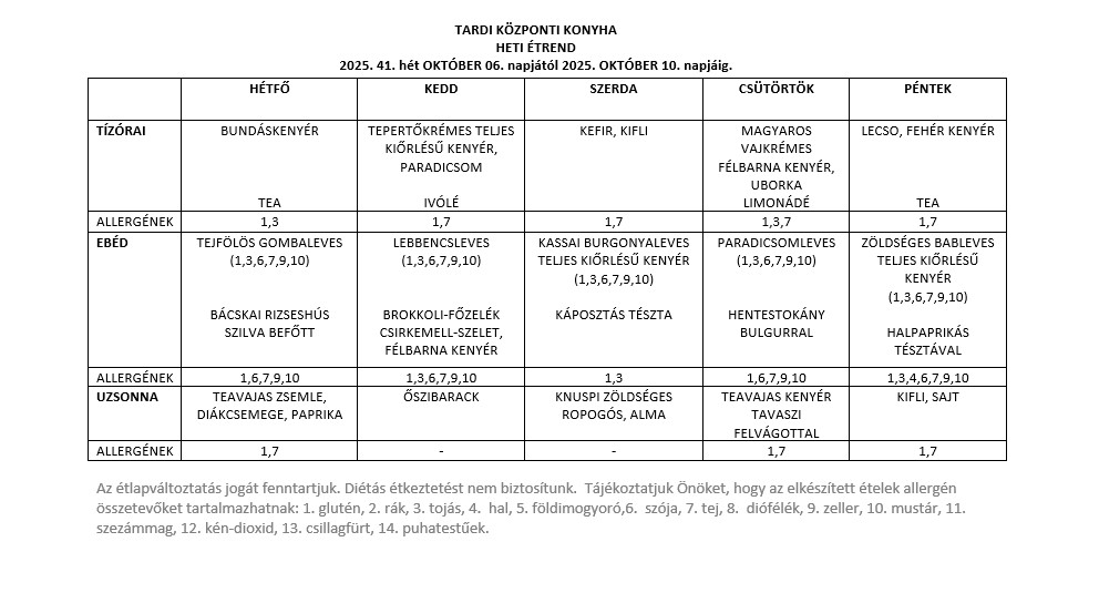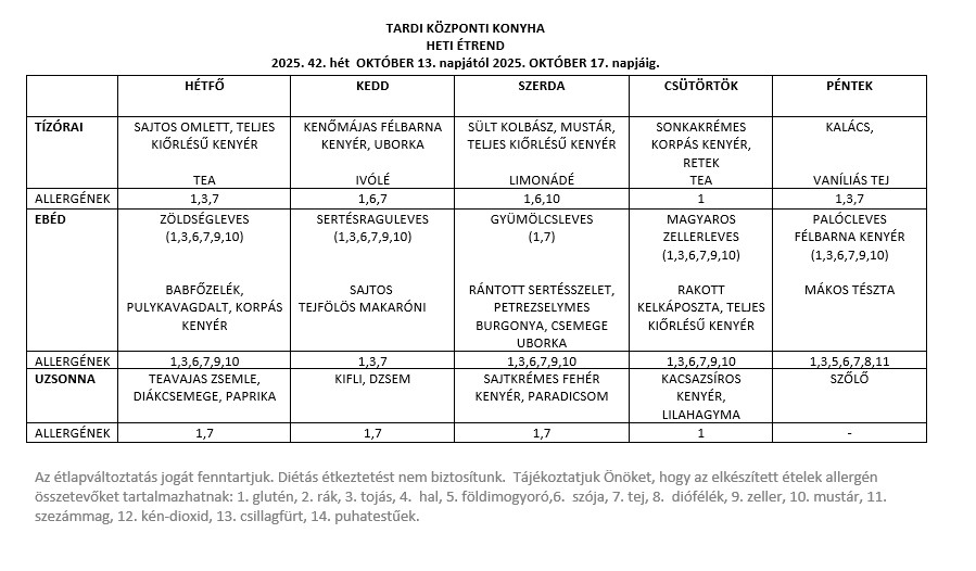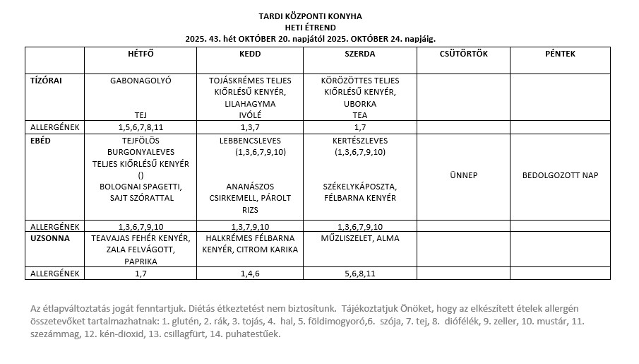 TARDI KÖZPONTI KONYHA HETI ÉTREND 2025. 43. hét OKTÓBER 20. napjától 2025. OKTÓBER 24. napjáig.