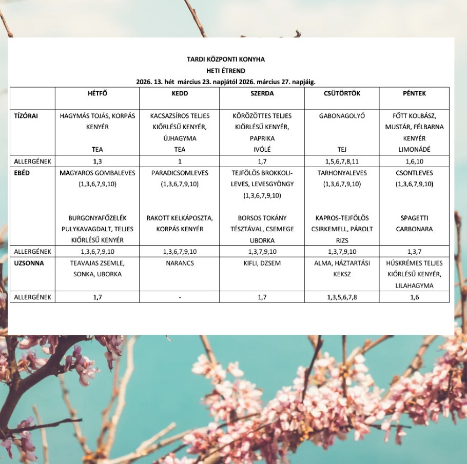 TARDI KÖZPONTI KONYHA HETI ÉTREND 2026. 13. hét március 23. napjától 2026. március 27. napjáig. Közzétéve: 2026.03.20.