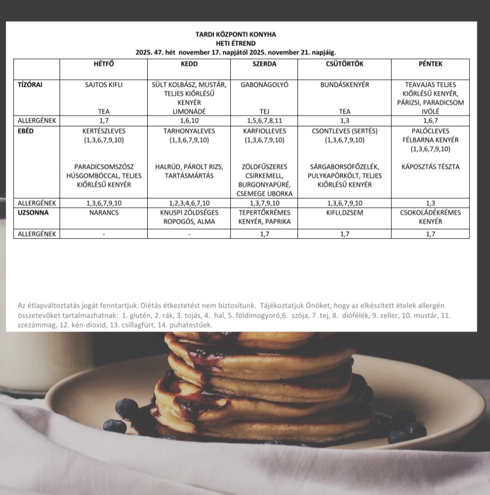 TARDI KÖZPONTI KONYHA HETI ÉTREND 2025. 47. hét november 17. napjától 2025. november 21. napjáig. Közzétéve: 2025.11.18.